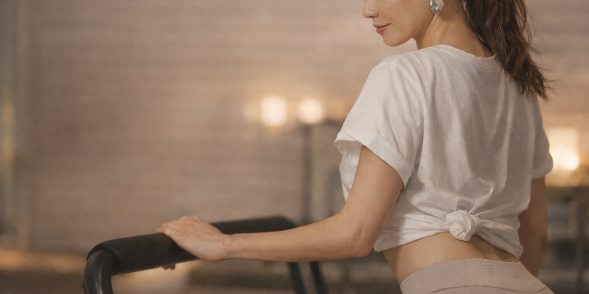 マシンピラティスで呼吸を整えながら、骨盤・背骨・肩まわりを正しい位置に調整します。
